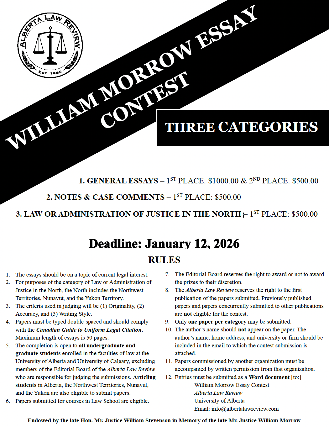 8. The Alberta Law Review reserves the right to first publication of the papers submitted. Previously published papers and papers concurrently submitted to other publications are not eligible for the contest. Only one paper per category may be submitted.